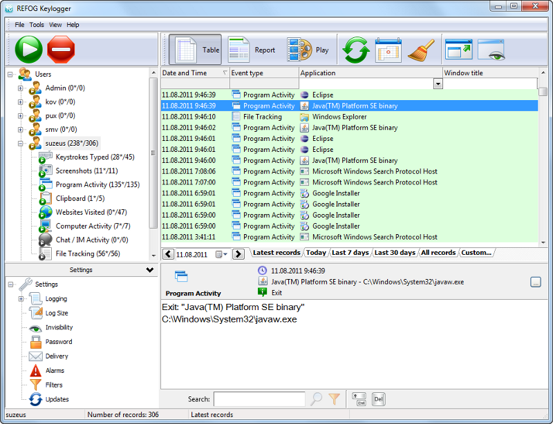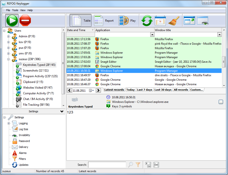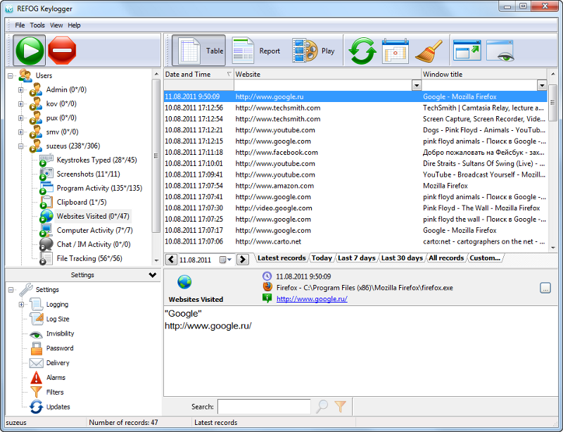 Le programme fonctionne en modes visible et invisible. Lorsqu'il est en mode invisible, ni la liste des processus, ni la liste des applications installées n'affichera le logiciel. Le programme est lancé au démarrage du système et enregistre les activités des utilisateurs dans des fichiers. Après l'envoi du rapport planifié, il supprime les journaux d'enregistrement et continue sa mission. Refog Logiciel Keylogger peut fonctionner parfaitement tout seul. Il effectue le travail du personnel de sécurité, mais est exempt de défauts humains.